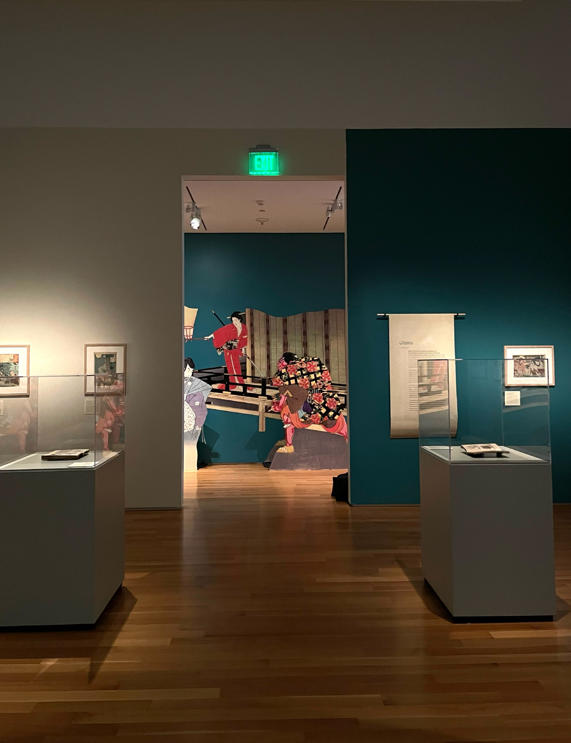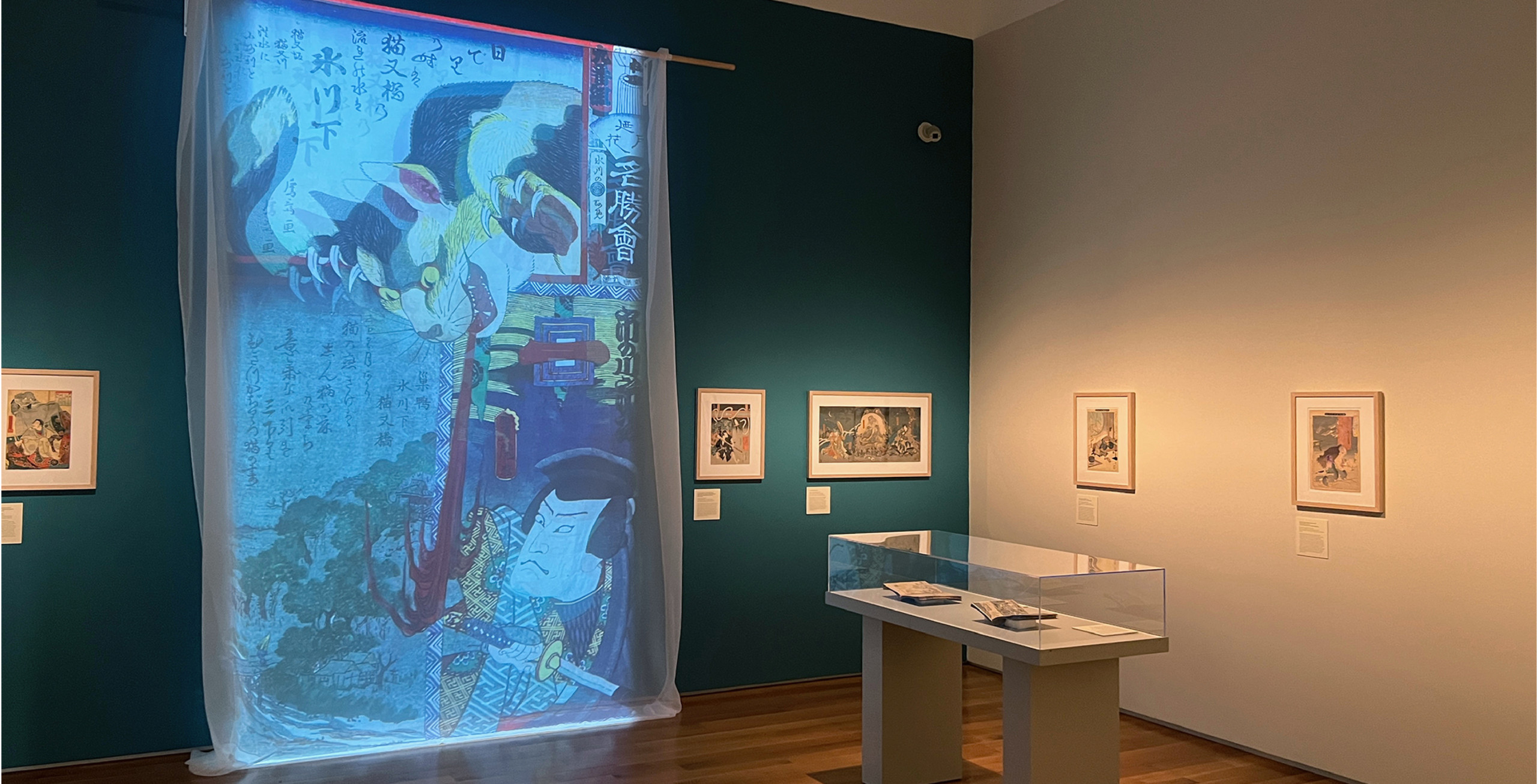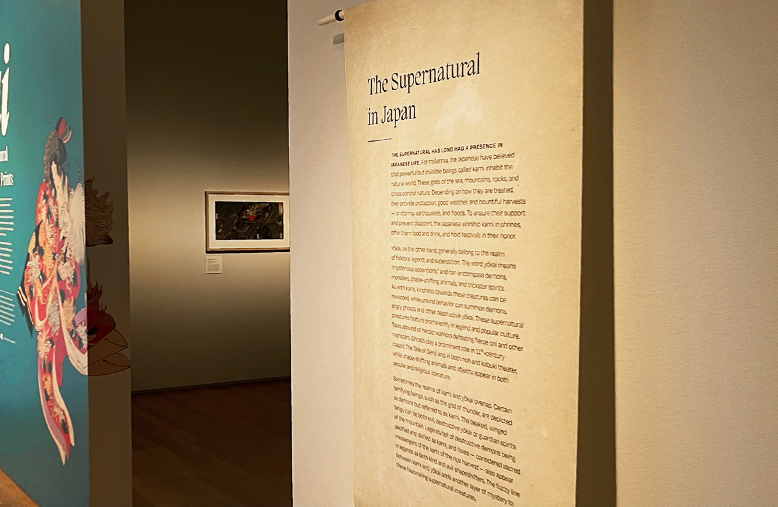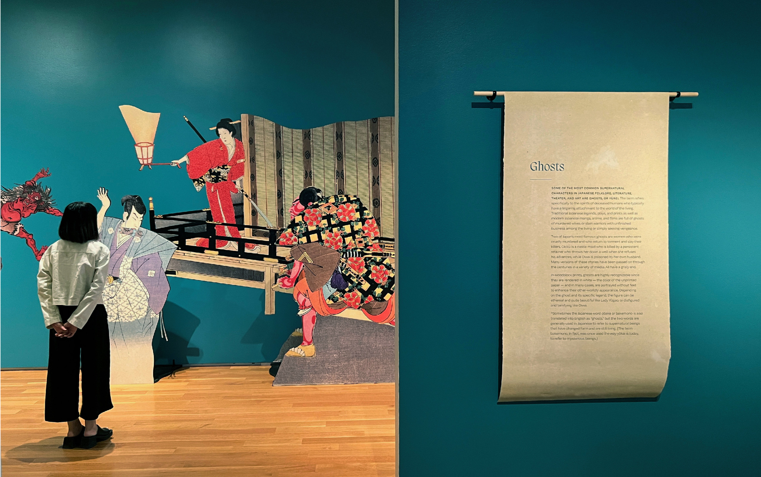 We curated and designed the exhibit space with teal accent walls, lightweight scroll-like forms and subtle animations projected on large mesh drapery in each room that evoked and immersed visitors into the ghostly apparitions of the Yōkai. The ambient low lighting and spotlights give each print its own moment in time. Some scenes also came to life using wood paneling as an invitation for visitors to interact and be a part of the Yōkai’s tales.