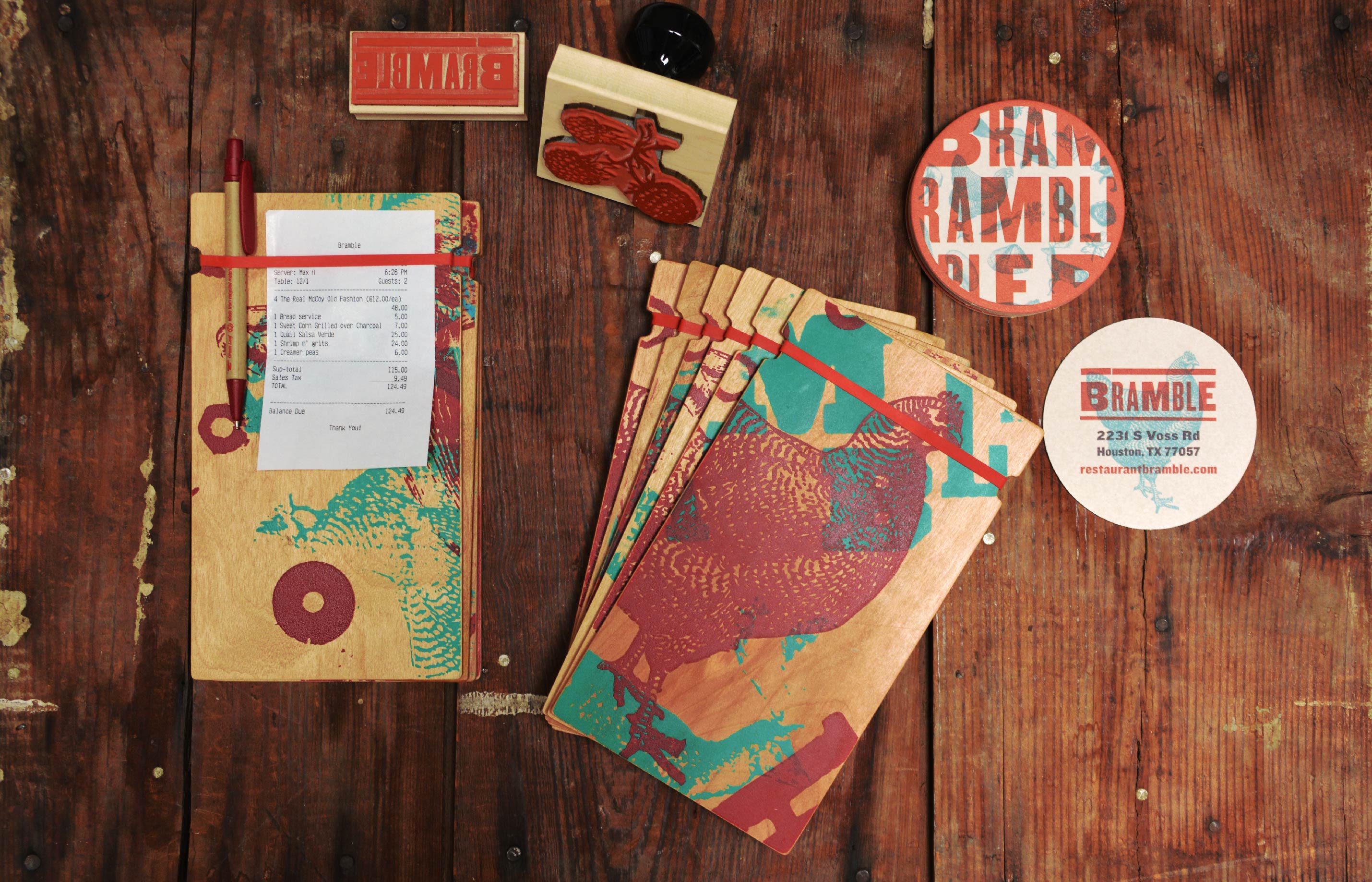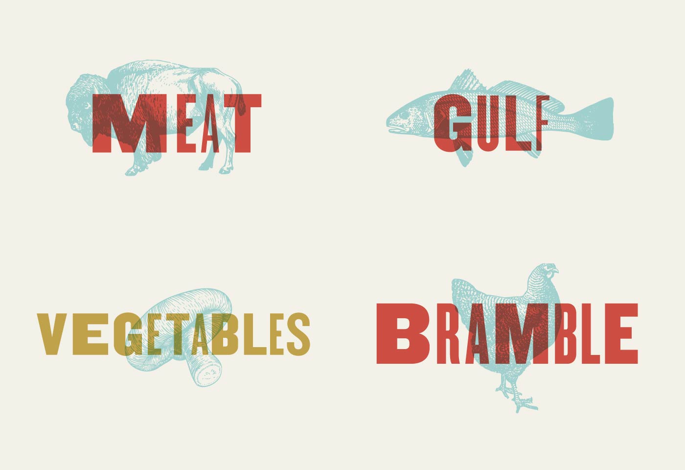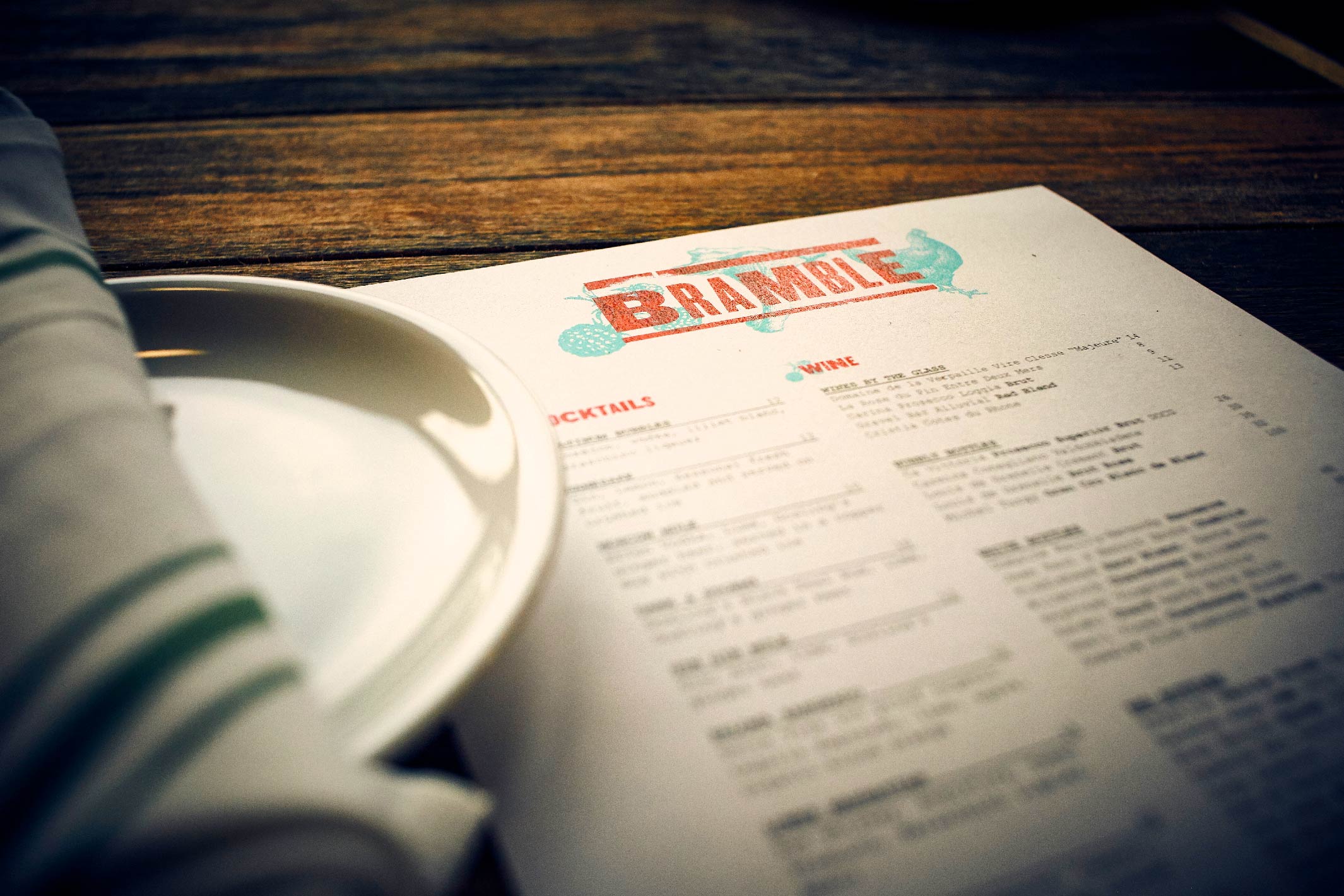 Randy Rucker’s latest restaurant Bramble features a daily-changing menu inspired by the ingredients the chef gathers each day. This idea is expressed in the brand by evoking the aesthetic of woodblock type, a typographer’s equivalent to foraging.