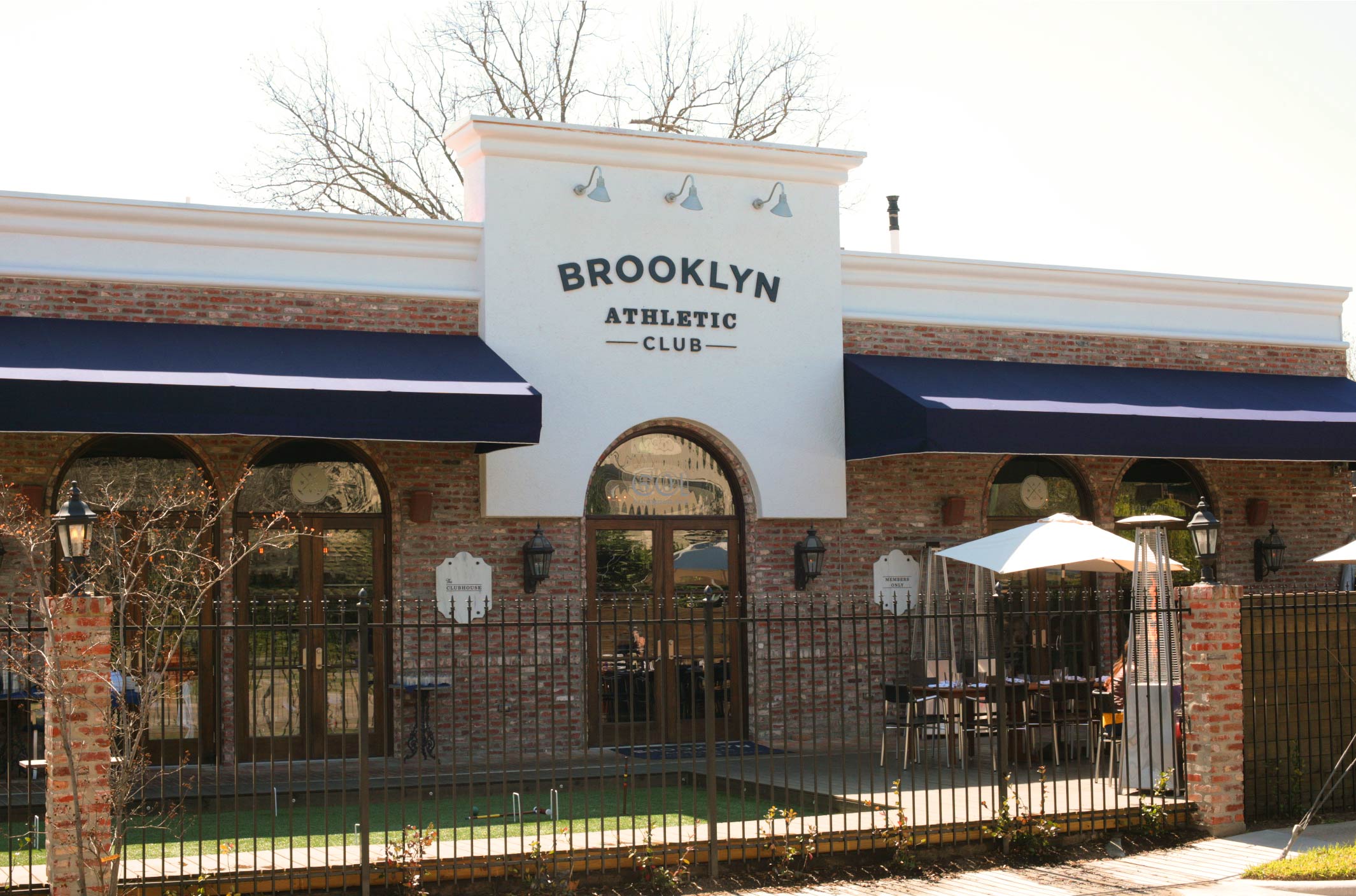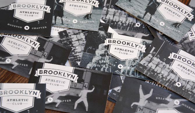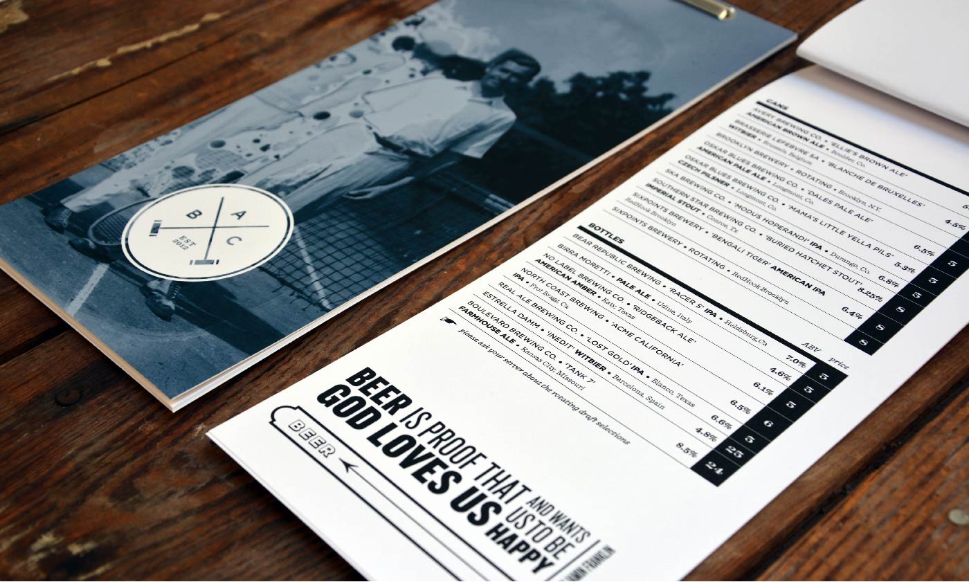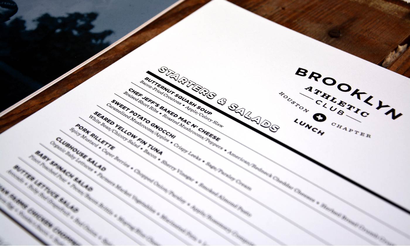 Brooklyn Athletic Club combines American comfort food with outdoor games like bocce and croquet. The branding recreates the attitude of an old-school Brooklyn sports club for Houston through signage, large-scale environmental graphics, landscape design, menus, interior artwork, and a food truck.