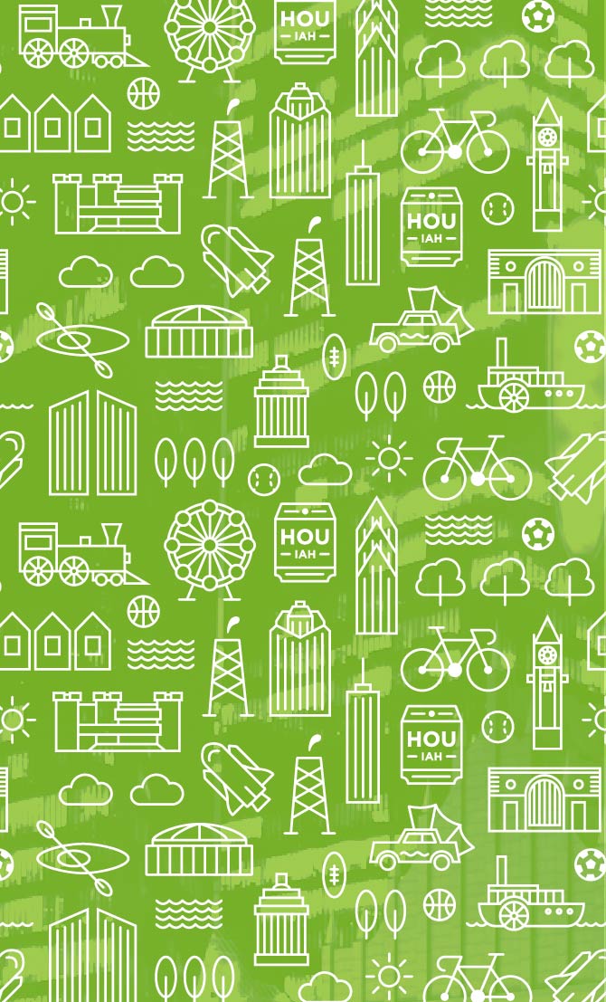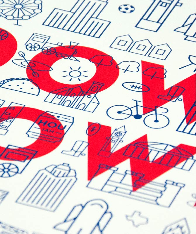 Funky iconography highlights Houston’s celebrated buildings and history, and some of the city’s iconic activities and favorite foods.