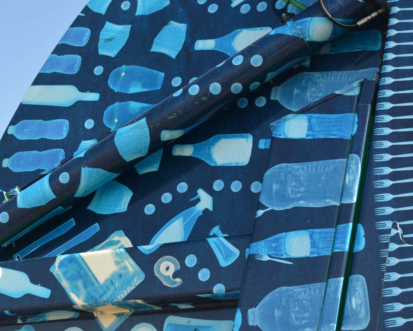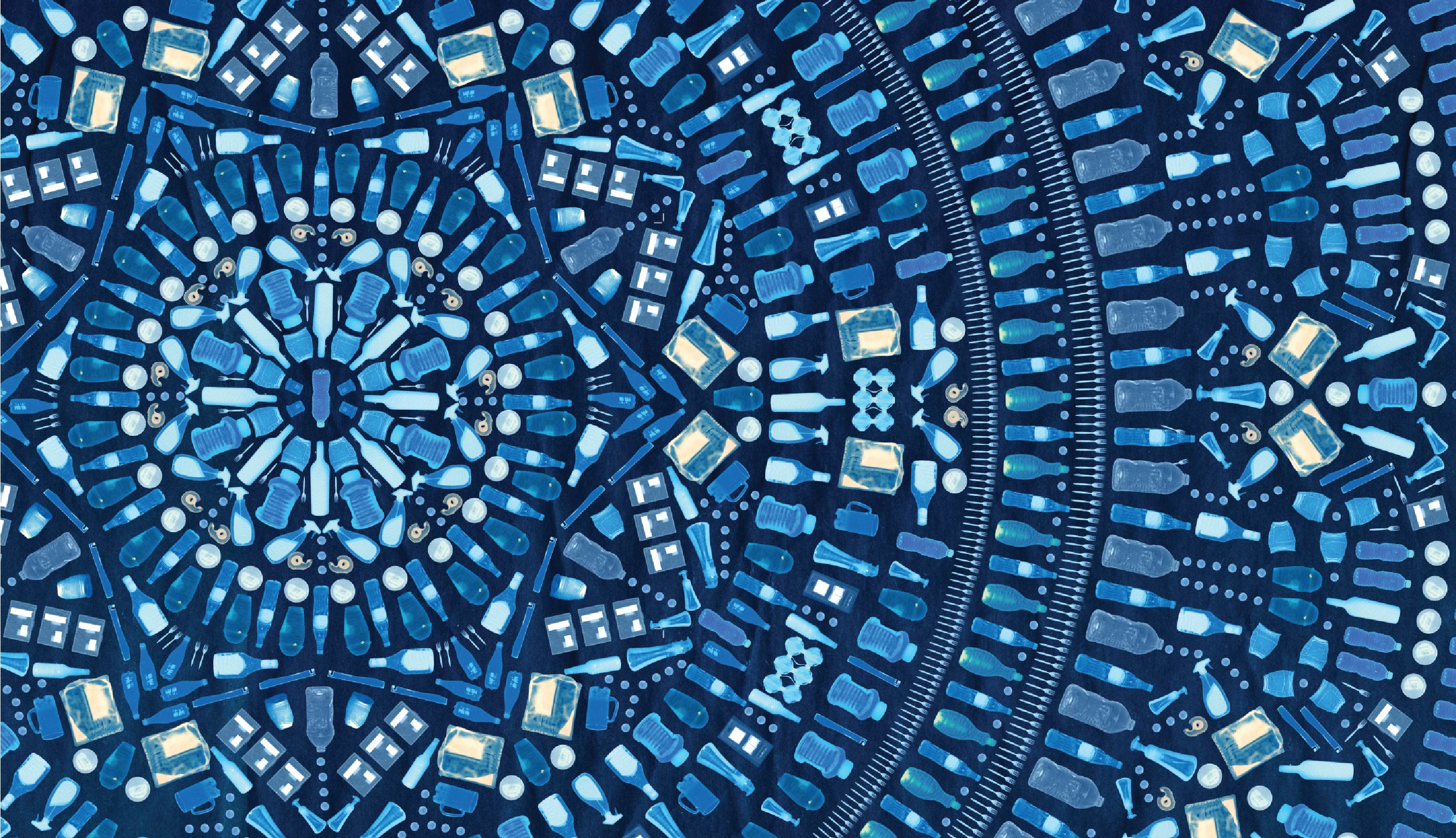 Using the sun as our light source, we created cyanotype prints (blueprints) of transparent recyclables. Like a haunting x-ray, the ghostly prints of these banal objects become a visual metaphor of the lasting environmental effects of the waste we produce. The mandala pattern, a “revelatory symbol of cosmic truths,” became a natural means to organize and create harmonic beauty out of trash.