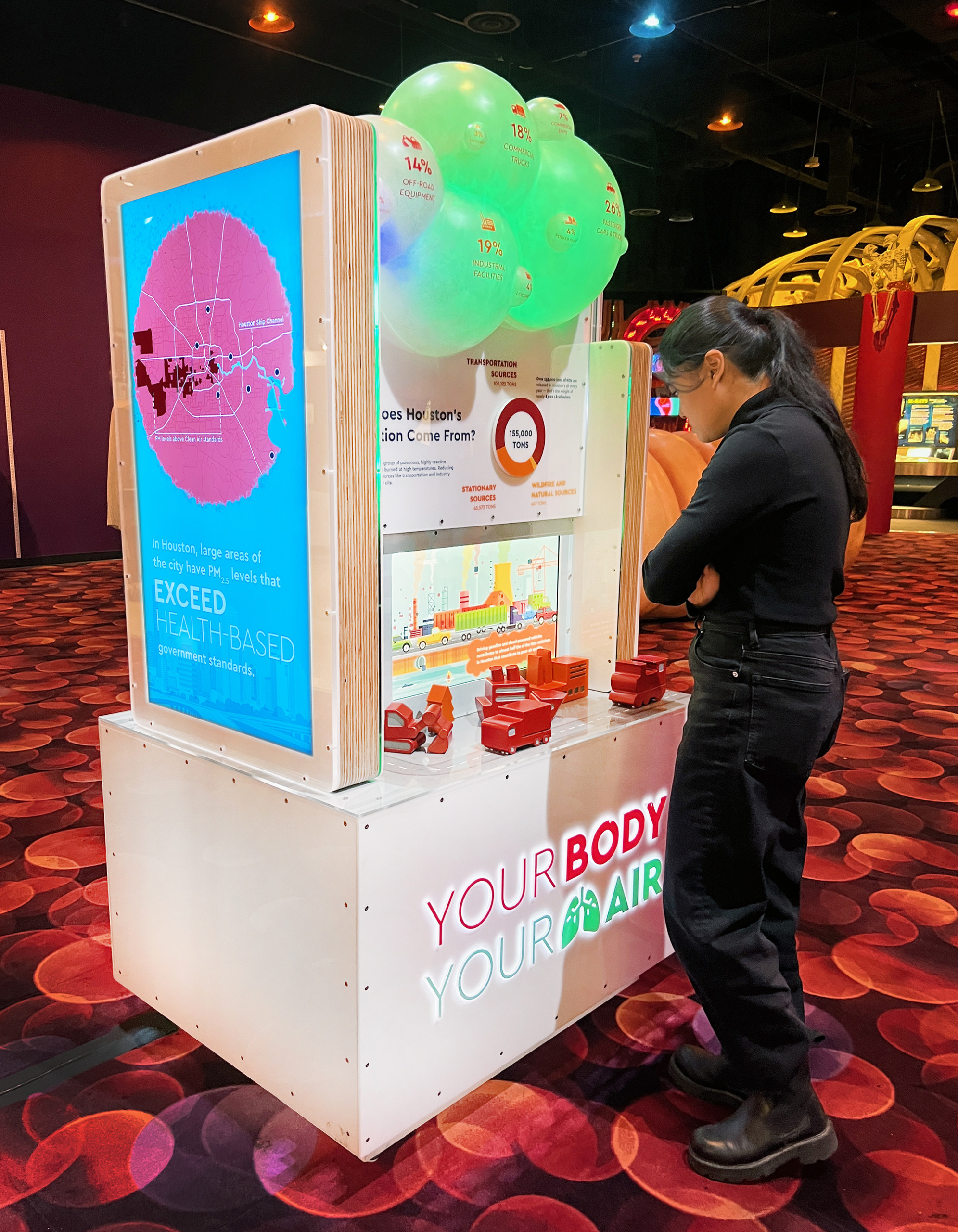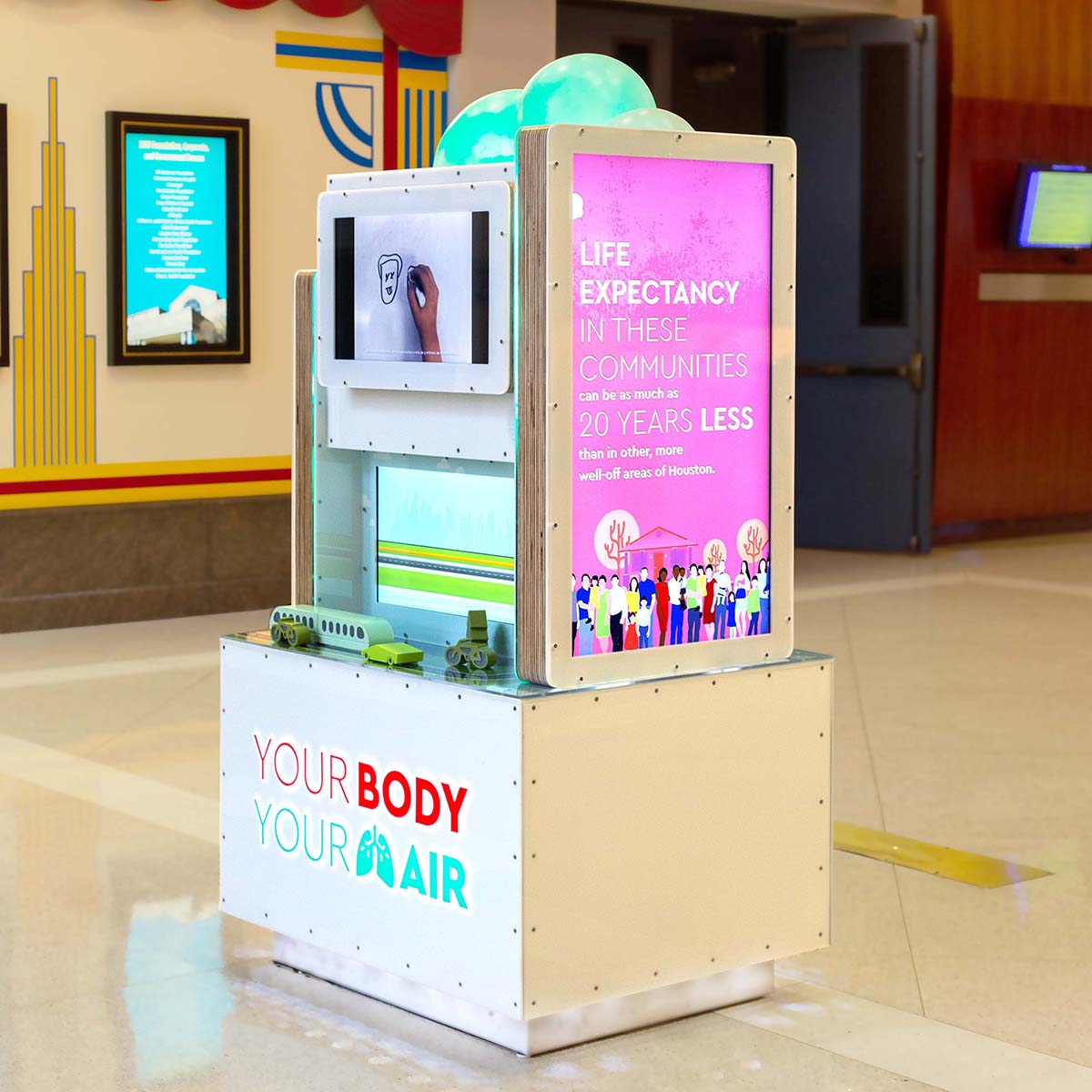 YOUR BODY / YOUR AIR is a recently completed miniature mobile museum for the Environmental Defense Fund and the Health Museum Houston. It focuses on air quality and the disproportionate amount of pollution in underserved neighborhoods in Houston. The exhibit includes several movies and animations about Environmental Injustices occurring in Houston and the effects of air pollutants on our bodies/lungs.